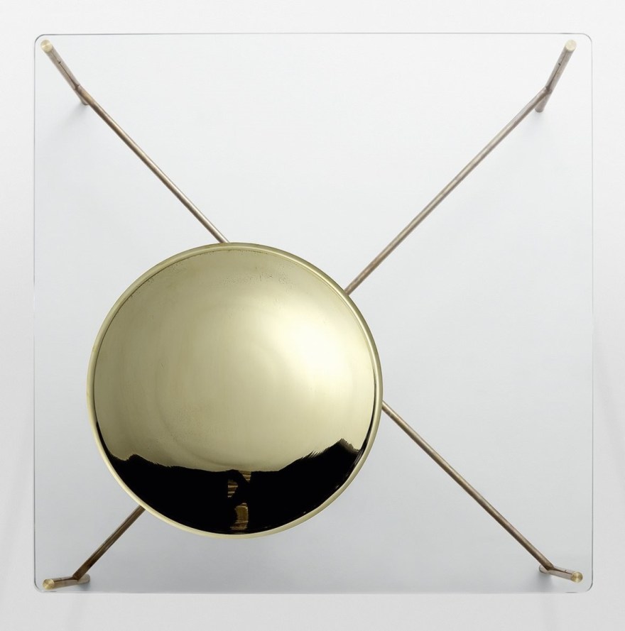 The Golden moon glass and metal coffee table is formed from a sheet of extra clear glass with dish insert formed from bright brass. The thin support frame is manufacture with a complimentary aged finish – burnished brass. The contrast between aged material and highly finished glass and brass offers a luxurious, rich, glass and metal table with substance.
